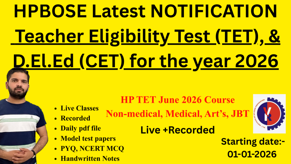 Notification Summary: In exercise of the powers conferred under Rule 2.2 of the Regulations of the Himachal Pradesh Board of School Education, the Hon’ble Chairman, HPBOSE, has approved the dates for the EMRSST, D.El.Ed (Common Entrance Test), and Teacher Eligibility Test (TET) to be held in the year 2026. This schedule is released to avoid clashes with other departmental recruitment and entrance exams.